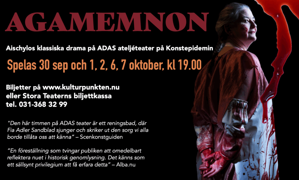 Efter föreställningar i Frankrike och Kungshamn är AGAMEMNON äntligen hemma igen! Nu väntar fem föreställningar på ateljéteatern på Konstepidemin. En uppsättning där vi med den mänskliga rösten i centrum ger gestalt åt tondövt förnuft och förtärande passion. Välkommen att uppslukas av vårt antika universum där frågorna om människans existens aldrig blir gamla!