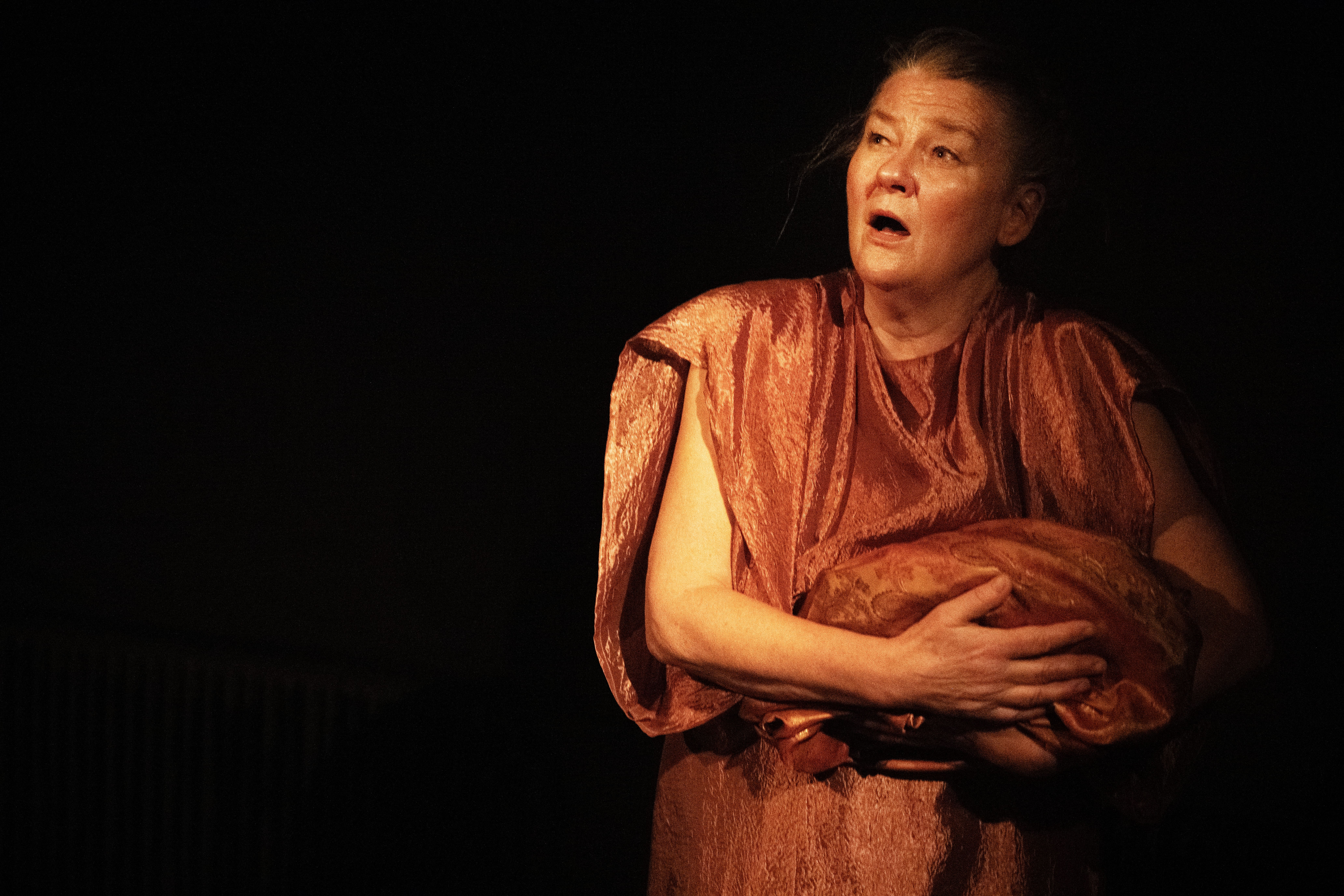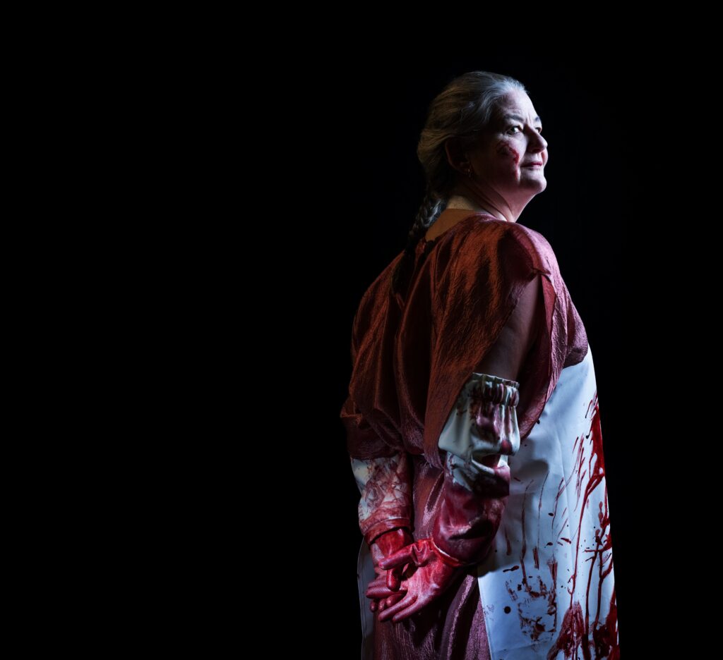 När vi öppnar portarna till den antika världen är det en vis men oansenlig äldre kvinna som beledsagar oss in i värmen. Hon tar oss genom en förfärlig värld där vreden gått överstyr och makten drivs av personliga, blodtörstiga övertygelser. Det tioåriga trojanska kriget har just kommit till ett slut och Agamemnon, kung av Mykene, välkomnas hem som segerherre och hjälte. I krigets hetta och för att blidka gudarna har han offrat sin dotter, Ifigenia. Hemma väntar Klytaimnestra trofast på sin make, men oerhörda känslor har tagit henne i besinning. Blod kommer att flyta.
